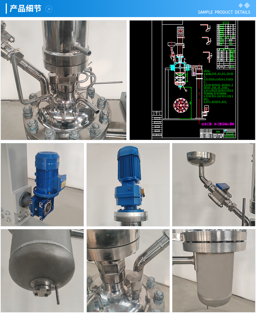 其他附件 如果用户在釜盖、釜体开口、内部结构、压力高低、搅拌桨叶、及增加其他辅助装置(如冷凝回流装置、冷凝器、恒压加料罐、接收装置)等有特殊要求,可完全按用户的要求加工制造